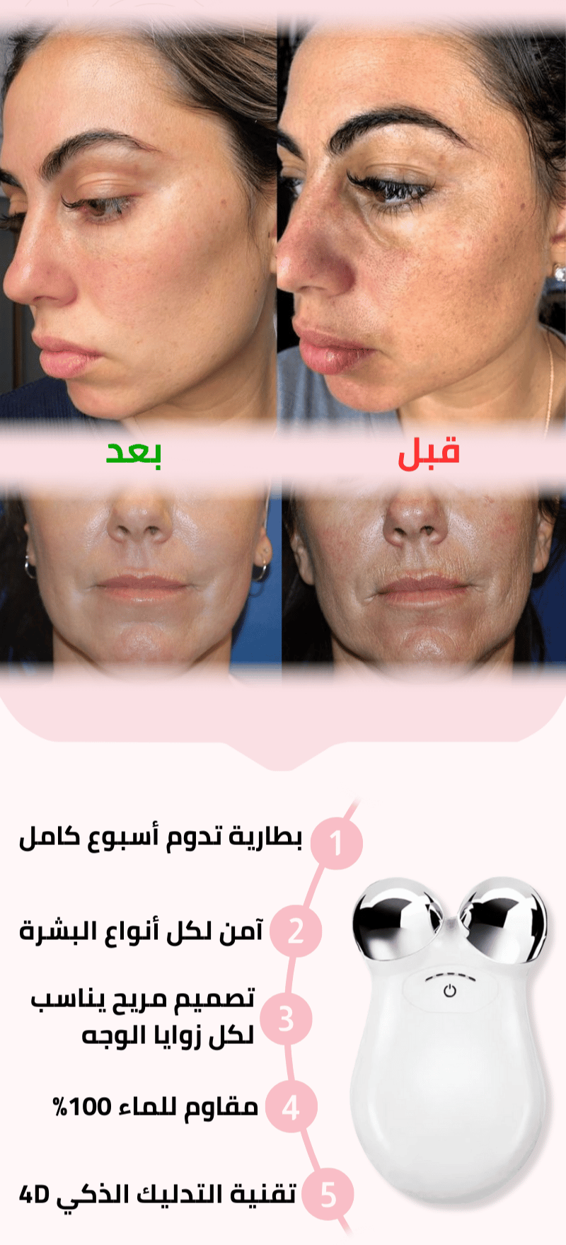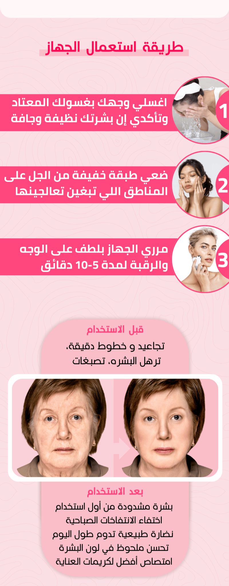 شوفوا كيف تغير وجهي! كنت أعاني من تجاعيد تحت عيوني وبشرة مرهقة، ولما جربت الجهاز هذا، الفرق كان واضح بعد أول استخدام. بشرتي صارت مشدودة وعيوني أكثر إشراقًا. أحس كأني رجعت لسنين ورا! أنصح كل وحدة تحب تهتم بنفسها تجرب الجهاز، لأنه فعلاً يستحق!